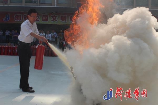 市消防公司庄兆海同志首先给大家详细讲解了灭火器灭火的的操作要领。在四个小组组长的指挥下,演练人员按照操作要领,分别进行了灭火演练。演练人员手提灭火器奔向“火灾现场”,大火在灭火器干粉的喷射下瞬间被扑灭。