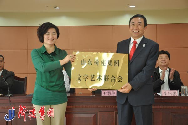 市文联党组书记、主席尹慧萍(左)向集团授牌