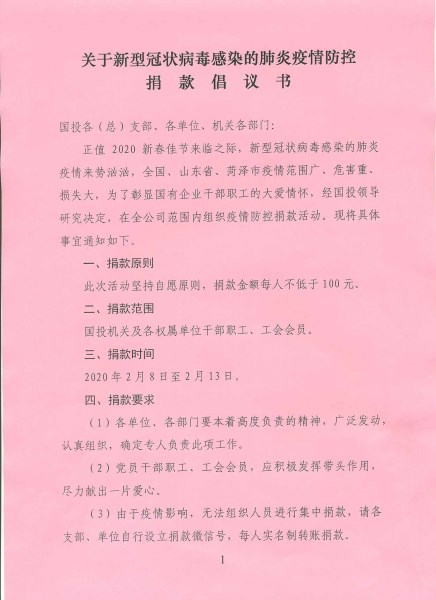 新冠肺炎疫情牵动着公司广大干部职工的心,闻悉奋战在抗击疫情一线的医务人员和各类工作人员防护物资紧缺的情况后,2月7日上午,国投公司党委第一时间召开党委会议,研究决定在全公司范围内组织疫情防控捐款活动,并于当日中午通过微信工作群,发布《关于新型冠状病毒感染的肺炎疫情防控捐款倡议书》,各单位、机关各部门积极响应,广泛发动,认真组织,确定专人负责此项工作。