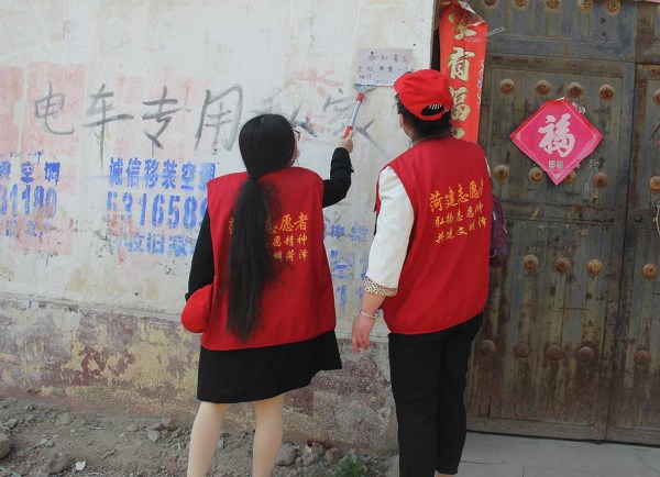 ![]() 菏建志愿者清理居民墙上的顽固小广告 |