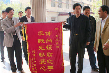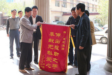2009年4月21日上午10时,菏泽市中医院马院长和基建处长、后勤主任一行三人专门来到best365英国在线体育,将一面绣着“伸出援助之手,奉献无私爱心”的锦旗送到best365英国在线体育领导手中,感谢best365英国在线体育又好又快建成的临时病房。