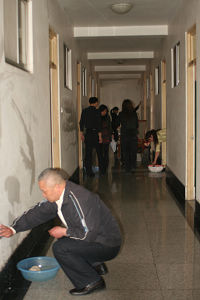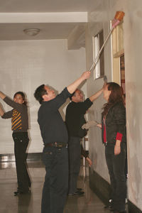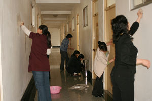 在劳动中,大家不怕脏、不怕累,有的用擦布、有的用钢丝球,还有的用拖把对办公楼的楼梯间和内廊墙壁进行认真擦洗。经过一个多小时的紧张劳动,办公楼内墙壁干净明亮了许多。同志们置身整洁的办公环境里,会心地说:“用这种方式庆‘五一’迎‘五四’很有意义。”