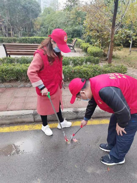 志愿者手拿垃圾袋、垃圾夹、铲子等清洁工具,将绿化带内散落的烟头、矿泉水瓶等垃圾捡起,并对社区内乱停乱放电动车、电动车逆行、乱扔垃圾等行为进行劝导。