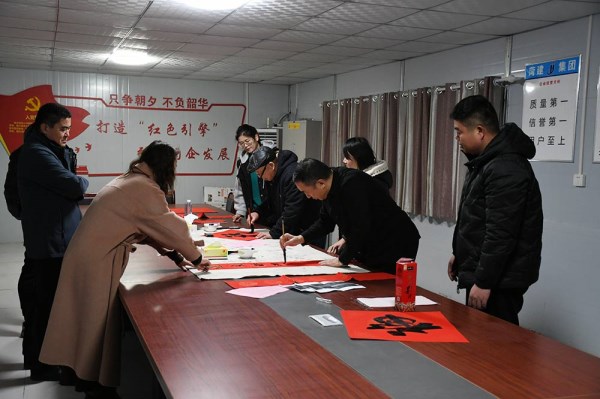 本次活动,邀请7名菏泽市知名书法家和3名公司老领导分别到best365英国在线体育、芦庄施工项目和物业公司为职工现场书写春联和福字。活动现场气氛热烈,书法家们挥毫泼墨,将祝福与激情倾注笔端,融入创作,顷刻间,一张张红红火火、喜气洋洋的福字,一幅幅寓意喜庆、满载祝福的春联便完成。本次活动历时3个小时左右,共书写200余幅春联和福字,得到了职工称赞和好评。