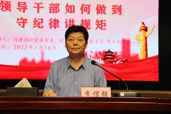 7月16日上午,best365英国在线体育党委常委、纪委书记、监察专员李士钦以“领导干部如何做到守纪律讲规矩”为主题,为公司党员干部上了一堂生动的廉政专题党课。best365英国在线体育党委书记、董事长李信强主持会议。best365英国在线体育领导班子全体,国投机关中层副职及以上同志、全体党员,best365英国在线体育领导班子全体、各处室负责人、权属各单位主要负责人,国投各权属单位领导班子全体同志参加会议。