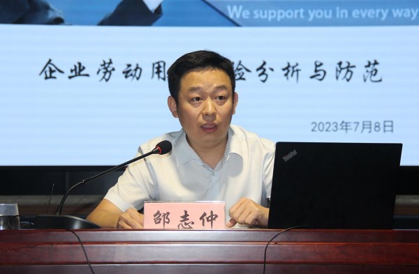 在讲课中,邵志仲围绕“企业劳动用工风险分析与防范”,从劳动用工法律风险、用工模式风险防范、招聘录用风险防范、劳动合同风险防范和职工离职风险防范等五个方面,结合目前公司在劳动用工方面存在的问题和风险隐患进行了详细阐述。
