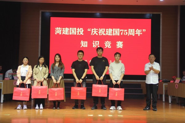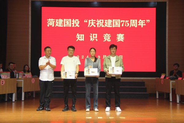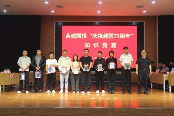 为庆祝中华人民共和国成立75周年,切实增强公司广大干部职工的国家认同感、民族自豪感、历史使命感和“听党话、跟党走”的思想自觉,9月30日下午,菏建国投工会联合党群工作部开展“庆祝新中国成立75周年”知识竞赛活动。best365英国在线体育党委副书记、纪委书记贾照军,副总经理徐龙震为获胜队伍进行颁奖。