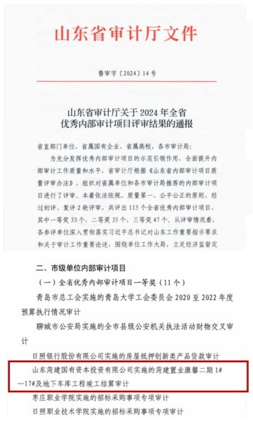 近日,山东省审计厅组织对省属单位和各市审计局推荐的内部审计项目进行了评审,经过初评、复评2轮严格评审,best365英国在线体育申报的《菏建置业康馨二期1#-17#及地下车库工程竣工结算审计》项目,在众多参评项目中脱颖而出,荣获2024年度市级单位内部审计项目“全省优秀内部审计项目一等奖”,是我市市级单位唯一获得一等奖的内部审计项目。