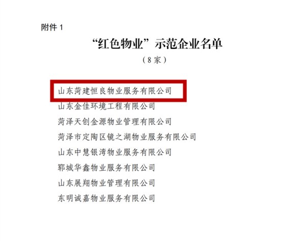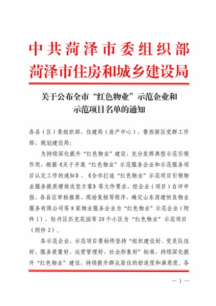 近日,市委组织部、市住房和城乡建设局联合发布文件,对全市红色物业示范企业及示范项目进行通报表扬。山东菏建恒良物业服务有限公司凭借突出的党建引领作用、卓越的服务品质和显著的工作成效,荣获“红色物业示范企业”称号;公司所管理的新河湾及贾宋庄项目,在众多项目中脱颖而出,荣获“红色物业示范项目”称号。