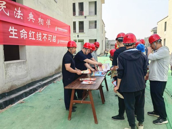 活动现场,通过悬挂普法宣传标语、发放普法宣传单页、现场答疑等方式,向建筑工人宣传《民法典》《安全生产法》相关法律知识。普法人员深入浅出解析《民法典》中与建筑工人息息相关的核心条款,重点解读《民法典》中合同签订、劳动权益保障、侵权责任等与工人切身利益相关的法律条款,以典型案例为切入点,将晦涩法条转化为通俗易懂的法律常识。同时,还结合《安全生产法》以及近期行业典型案例,直击施工领域高频风险点,通过剖析高处作业坠落、机械伤害、触电等事故成因,将抽象法条转化为通俗易懂的“身边事”,让法治思维在问答间悄然生根。