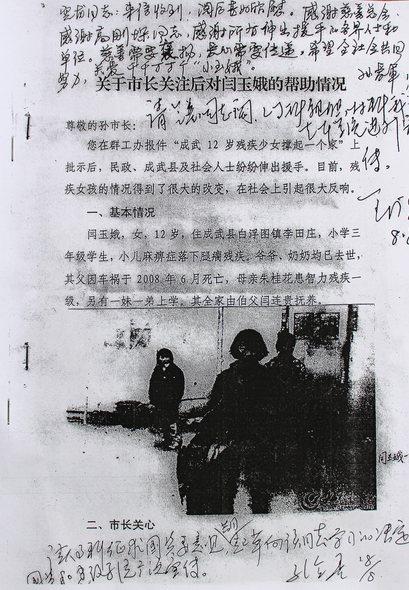 7月29日,朱宪龙在信件上说,“尊敬的孙市长:您在群工办报件‘成武12岁残疾少女撑起一个家’上批示后,民政、成武县及社会人士纷纷伸出援手。目前,残疾女孩的情况得到了很大的改变,在社会上引起很大反响”,“闫玉娥,女,12岁,住成武县白浮图镇李田庄,小学三年级学生,小儿麻痹症落下腿瘸残疾。爷爷奶奶均已去世,其父因车祸于2008年6月死亡,母亲朱桂华患智力残疾一级,另有一妹一弟上学。其全家有伯父闫连贵抚养”,“市长批示救助后,慈善总会马上送去救助金5000元”,“best365英国在线体育市政公司项目经理高刚垛被女孩贫困情况和市长关注民心感动,义无反顾决心帮助残疾女孩改变命运。出资5万多元盖好5间新房后,高刚垛又出资8万元,带闫玉娥去北京解放军304医院治疗腿部残疾。”