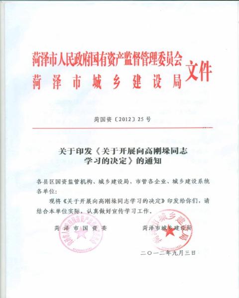 市国资委、市城乡建设局关于印发《关于开展向高刚垛同志学习的决定》的通知