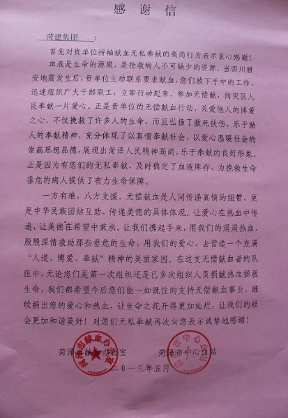 今年4月23日,雅安地震后,集团公司第一时间做出反映,组织开展了以“best365英国在线体育情系雅安,爱心献血救助生命”为主题的献血活动,是全市第一家为震区献血单位。活动中,集团干部职工积极响应,共有122名同志踊跃报名参加,73名同志成功献血,献血总量达28400毫升。此次活动的成功开展,为全市爱心公益事业起到良好的示范带头作用,受到省电视台、市电视台、《齐鲁晚报》、《牡丹晚报》、菏泽大众网等多家宣传媒体的竞相报道。