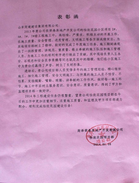 近日,第一项目管理公司施工的荣泰怡欣花园工程在年度“质量、安全、进度、施工文明”比武中荣获第一名,得到业主委员会、业主工程部、监理公司的一致好评。1月9日,菏泽荣泰房地产开发有限公司的张月山书记和谭华伟经理向集团公司送来“表彰函”,集团党委副书记任永信和副总经理葛庆斌接待。
