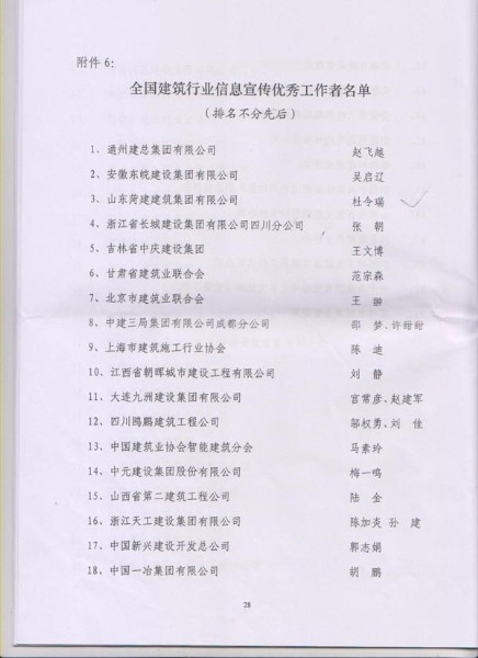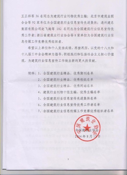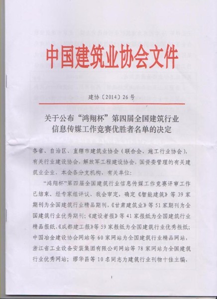 8月12日,在中国建筑业协会下发的建协[2014]26号《关于公布“鸿翔杯”第四届全国建筑行业信息传媒工作竞赛优胜者名单的决定》文件中, 按照参评要求,优中选优、实事求是推荐,经中国建筑业协会组织专家评审、审核确定, 集团公司被评为“全国建筑行业信息宣传先进集体”,《best365英国在线体育报》被评为“全国建筑行业精品报纸”,集团网站被评为“全国建筑行业优秀网站”,杜令瑞同志被评为“全国建筑行业信息宣传优秀工作者”。这是best365英国在线体育报纸和网站首次荣获全国最高奖项,同时也填补了全市建筑行业信息传媒工作中的一项空白。
